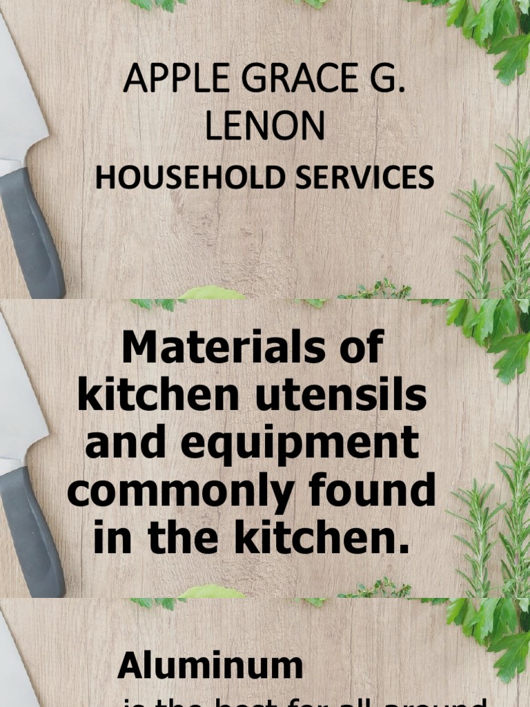 Most utensils need to be stiff, but the material that is used is only part of the story. All utensils and equipment in the kitchen is either made from stainless steel or aluminum. Used for separating solid materials from liquids and washing veg and fruits. Paring knife, set of nested measuring cups, rubber scrapper, mixing spoons. bring at least 10 pictures of different equipment.